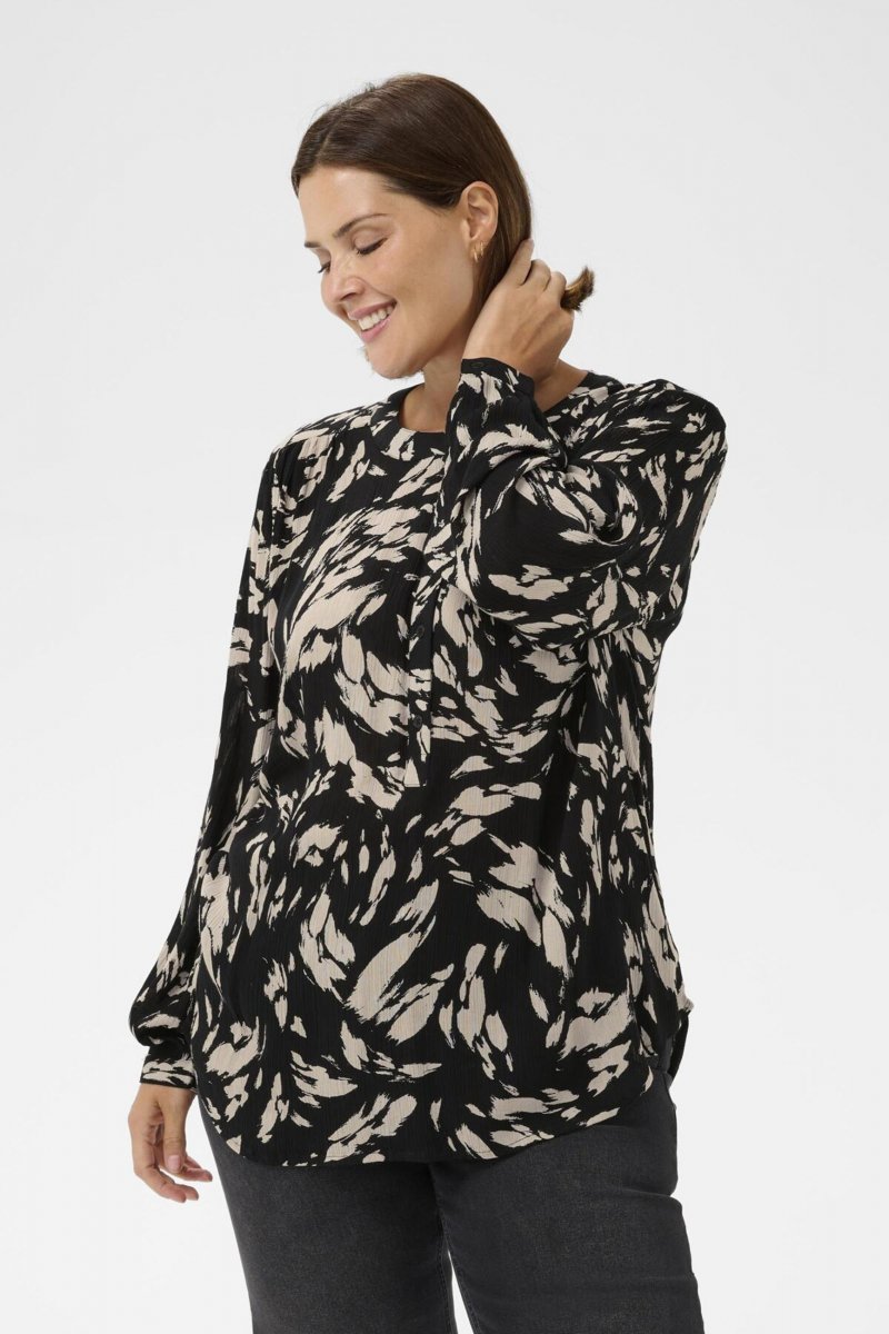 Långärmad blusFinns hos oss i storlekar 42–54Från märket Kaffe CurveTillverkad av 100 % viskos (LENZING™ ECOVERO™)Normal passformFärgen är svartKlicka här för att se storleksguiden