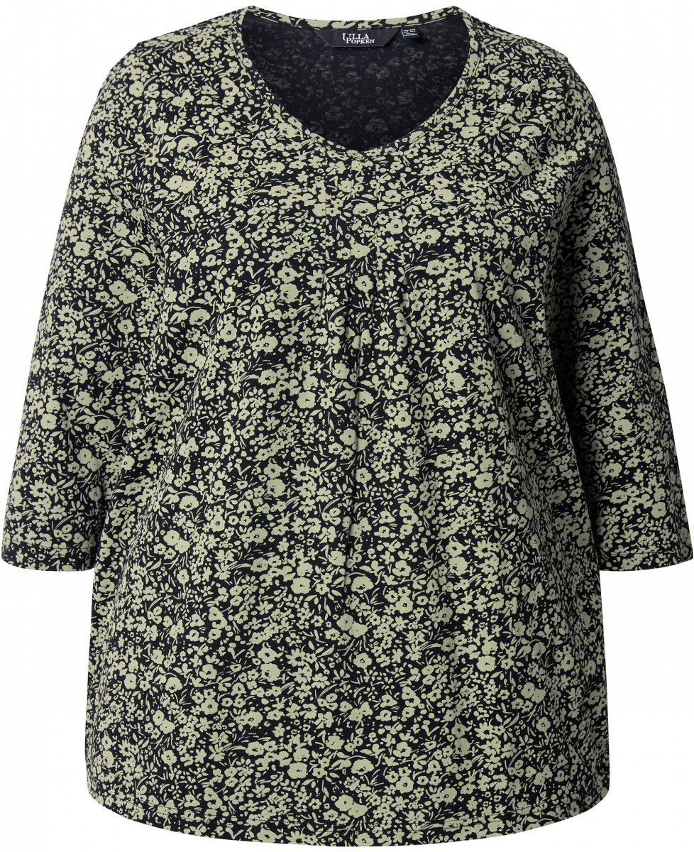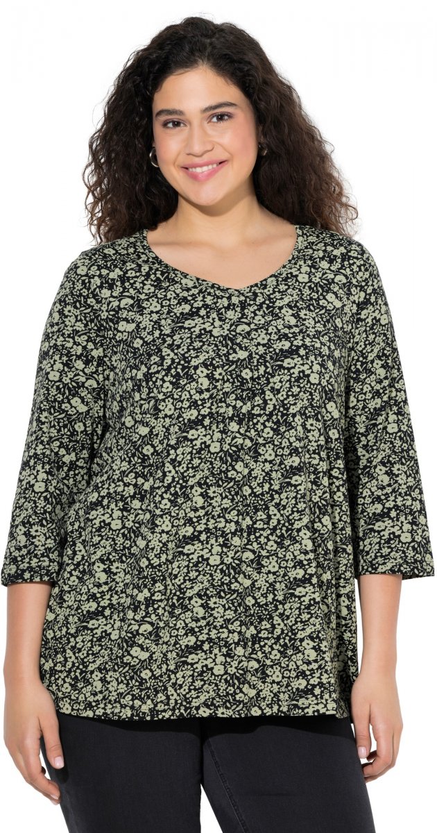 Storleksguide - Ulla Popken Pleated Floral Print 3/4 Sleeve Tee Pond Green