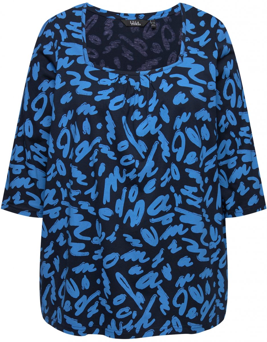 Ulla Popken Scribble Print Square Neck 3/4 Sleeve Tee Navy