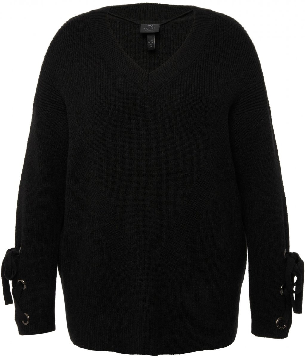 Ulla Popken Lace-Up Cuff Long Sleeve V-Neck Sweater Black