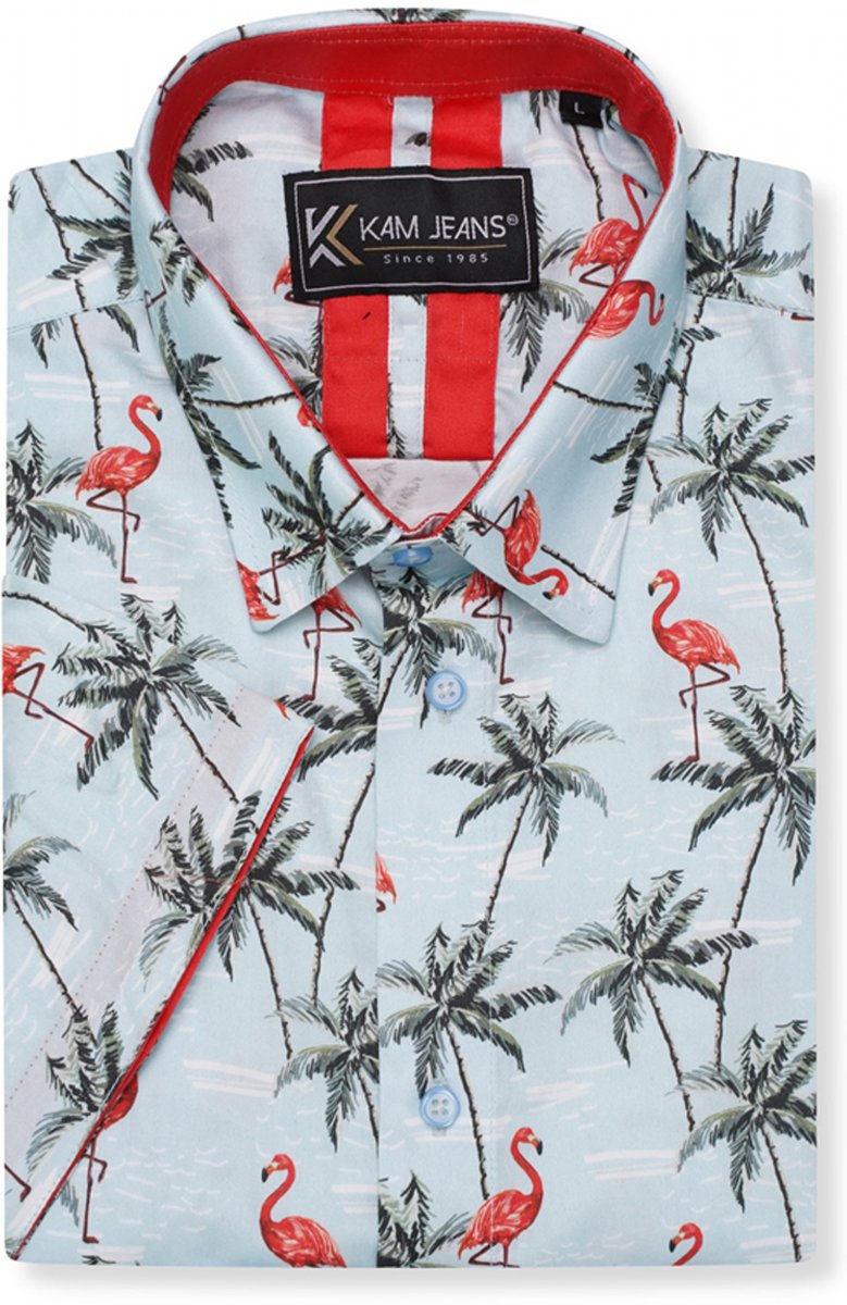 Storleksguide - Kam Jeans 6067 Flamingo and Palm Tree Short Sleeve Shirt Blue