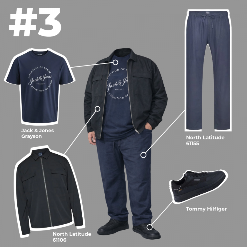 Tack vare de lätta lagren är den här outfiten enkel att anpassa under dagen. T-shirten håller helheten enkel, den kortärmade skjortan ger lite extra värme, och de korta jeansshortsen tillsammans med sneakers gör outfiten bekväm för vardagen.